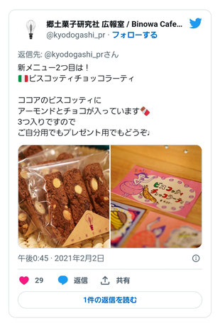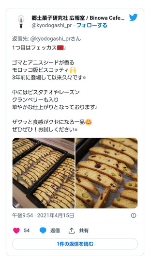 昨夏販売されたクッキー缶に入っていた、クロワッサンのような形をした白い小さなクッキーがとても美味しくて、また食べたいなと思っていました。ぜひ、レギュラー商品として販売していただけないでしょうか。また、ビノワカフェのバクラバも食べてみたいです。